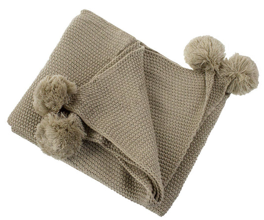 Khaki Chunky Knit Pom Pom Throw Blanket - 50"x60"