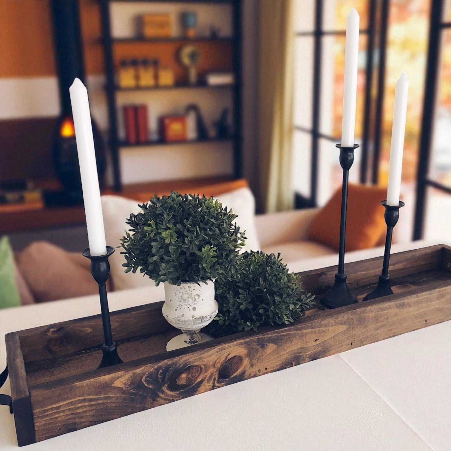 This tray is perfect for decorating, especially sitting on the table filled with accents to highlight any room. The tray is made with wood so variations should be expected. Dark brown lightweight decorative leather handles really make this trough stand out. Tray is finished with a dark walnut stain. It measures 36" long x 7” wide x 2 3/4” high. Approx. size, outside dimensions.