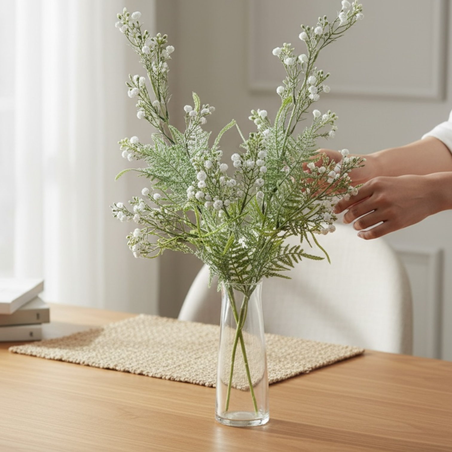 Elevate your floral arrangements with this premium frosted baby's breath spray. Standing 31 inches tall with four generous sprays, each stem features a soft-touch finish that mimics the delicate beauty of fresh flowers without wilting. The frosted white coloring adds an elegant sophistication perfect for table centerpieces, wreaths, and year-round home décor. This designer-picked selection brings lasting charm and texture to any space.