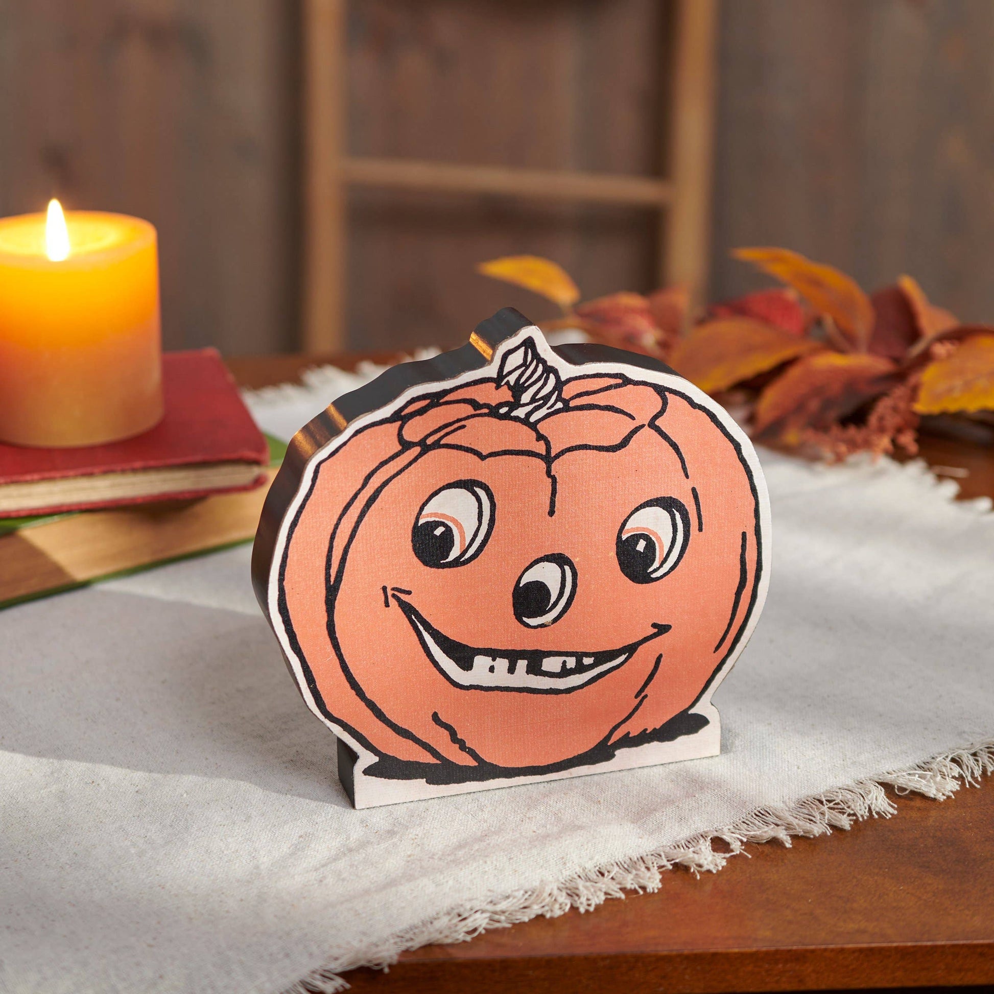 This wooden sitter is cut in the shape of the displayed vintage design of a happy jack o'lantern and stands 6" tall. This Halloween sitter features coordinating black color on sides and back. It is designed to free-stand alone on flat surface. A fun seasonal home accent that can be easily displayed in any home or work space.