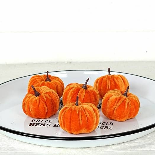 Add a cozy touch to your fall decor with this set of six 2.5-inch mini velvet pumpkins. Their soft texture and vibrant orange color bring warmth and seasonal charm to any space, perfect for tabletops, mantels, or festive displays. These petite pumpkins are ideal for creating a welcoming autumn atmosphere in your home.