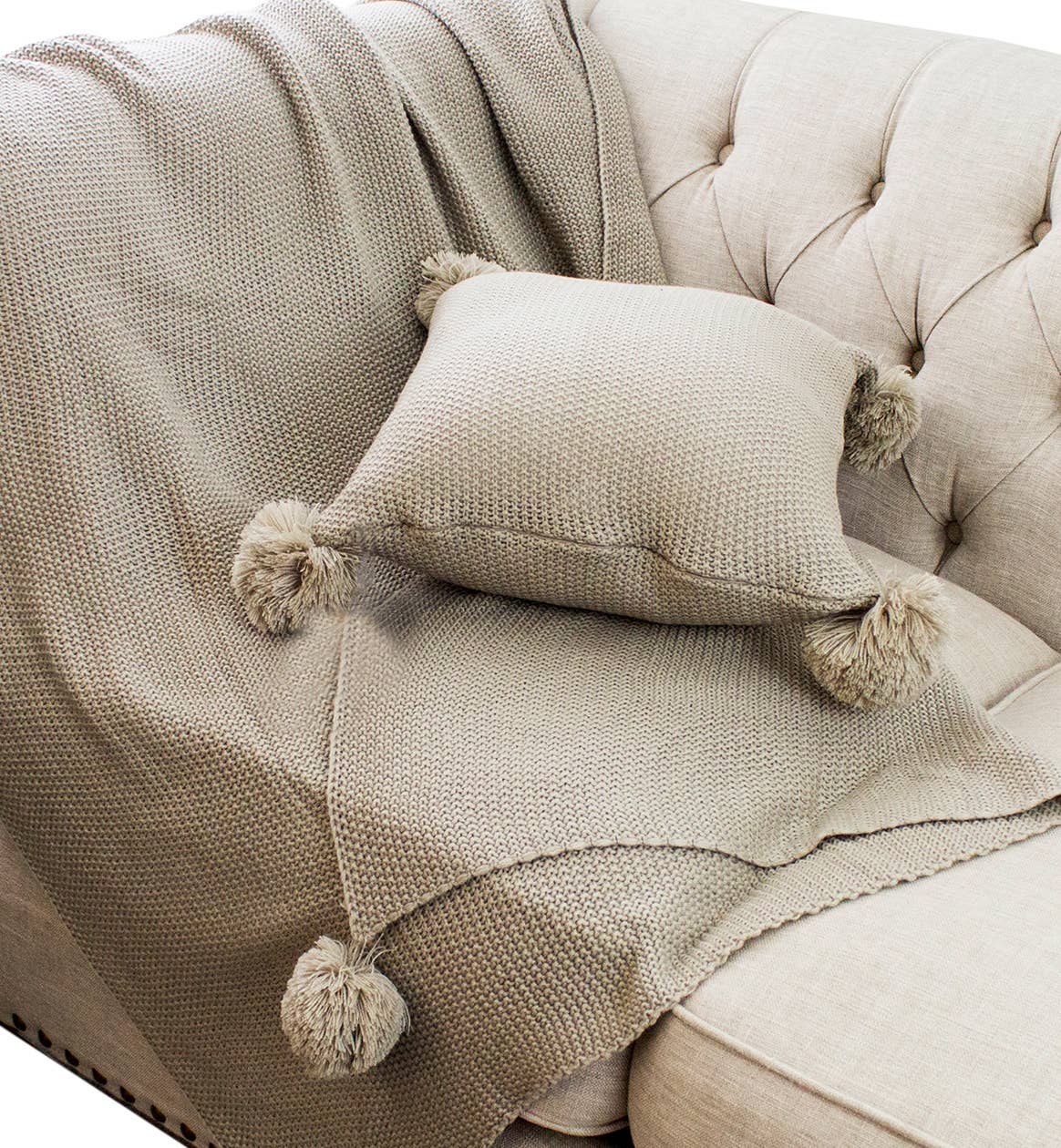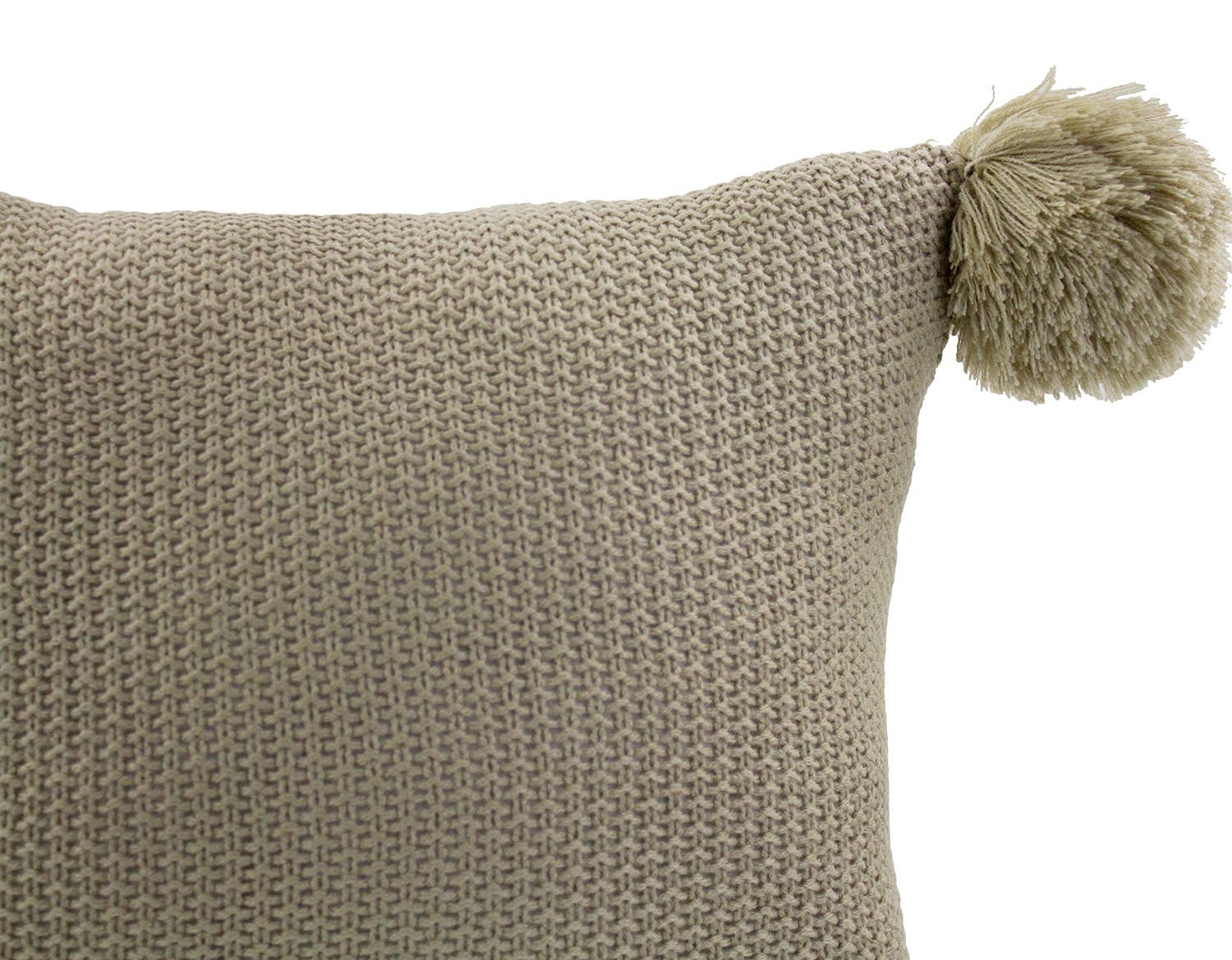 Featuring a chunky knit cover in a khaki color, this contemporary throw pillow is finished with soft, pom pom details at each corner and a plump and durable hollow fiber filling. This throw pillow is perfect for any modern living space, ideal for use on furniture such as couches, beds and sofa beds.