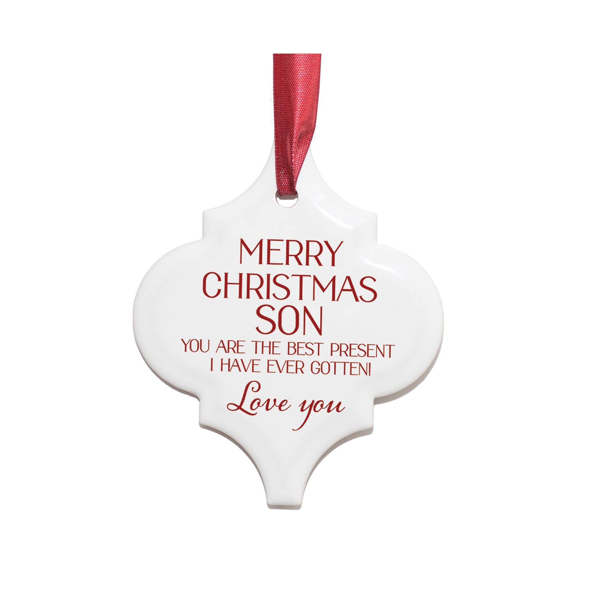 This charming ceramic ornament features an elegant marbled Arabesque design with a heartfelt sentiment, perfect for spreading holiday cheer. Measuring 5" x 5" with a glossy finish, it's beautifully versatile—display it upright using the included clear easel or lay it flat as a decorative coaster. Four protective silicone feet safeguard your furniture from scratches. A thoughtful gift that doubles as functional décor for the season.