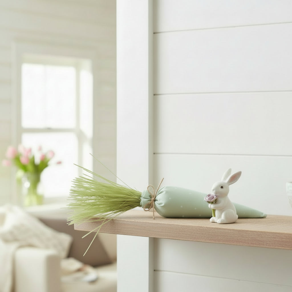 Add a playful garden-inspired accent to your home with this charming fabric carrot. Crafted in soft pastel green with cheerful polka dot detailing, it brings whimsy and warmth to any room. Standing 7" tall at the carrot top, or at the longest length, 12" to the tip of the grassy stem, this piece is perfectly sized for shelves, mantels, or as a standalone décor statement. Ideal for spring refreshes, children's spaces, or anyone who loves botanical and farmhouse aesthetics.