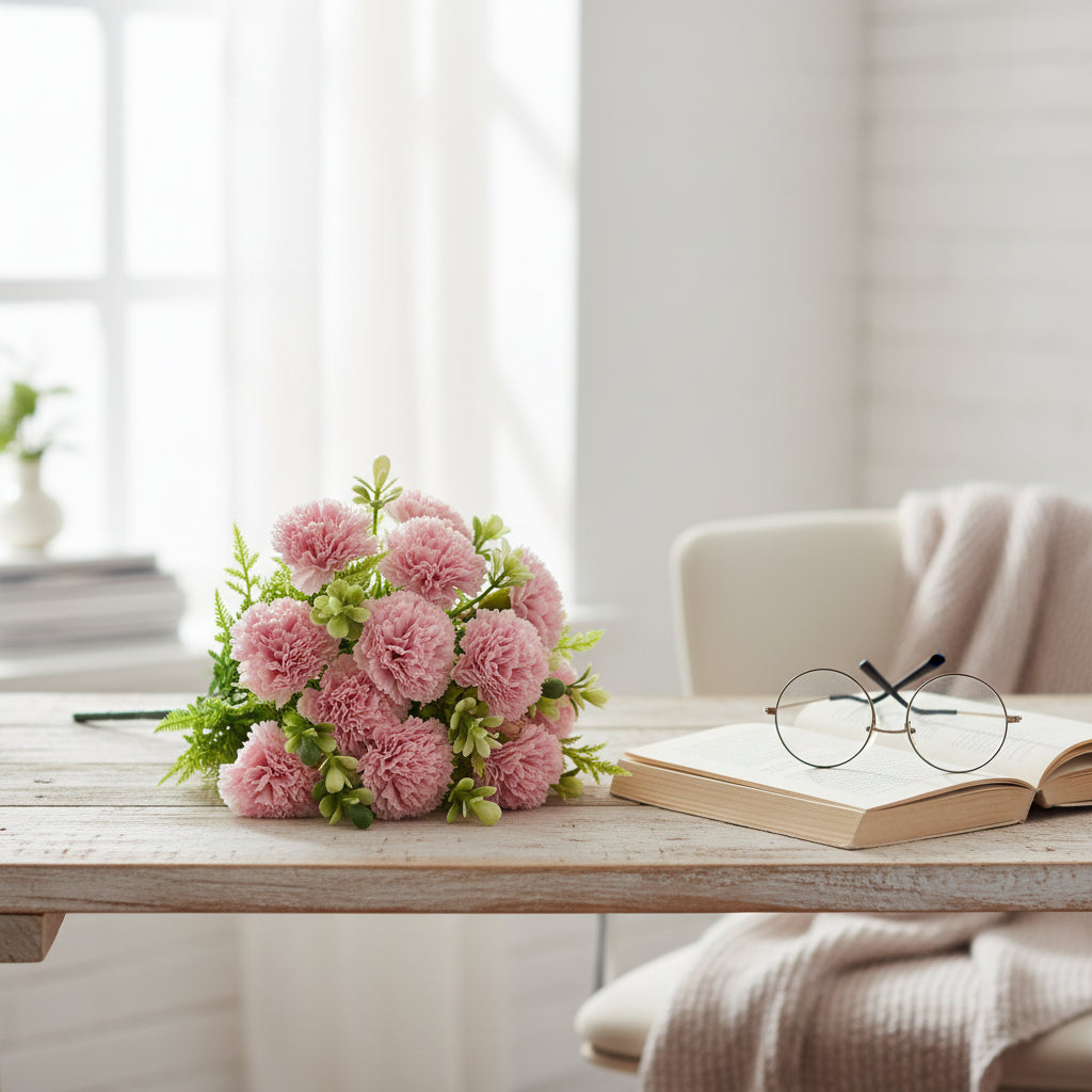 Transform your space with this exquisite pink carnation bunch—16 premium artificial blooms crafted to capture the delicate beauty of real flowers. Standing 12 inches tall, these maintenance-free florals bring enduring elegance to shelves, nightstands, and living areas without fading or wilting. The soft, creamy petals create a sophisticated focal point that complements any décor style, offering year-round charm and visual interest with zero upkeep required.