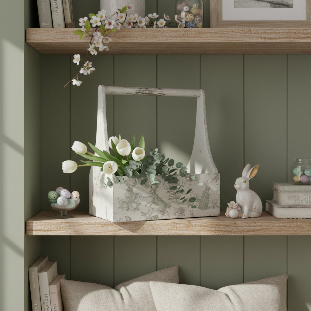 Bring timeless elegance to your spring displays with this charming Vintage Bunny Crate. Measuring 7"x13"x11", this decorative piece captures the delicate aesthetic of Victorian design with its classic proportions and nostalgic appeal. Perfect for Easter arrangements, seasonal tablescapes, or year-round farmhouse décor, it adds warmth and character to any room. Use it to showcase spring florals, nest eggs, or cherished collectibles. An ideal accent for those who appreciate vintage-inspired home styling.